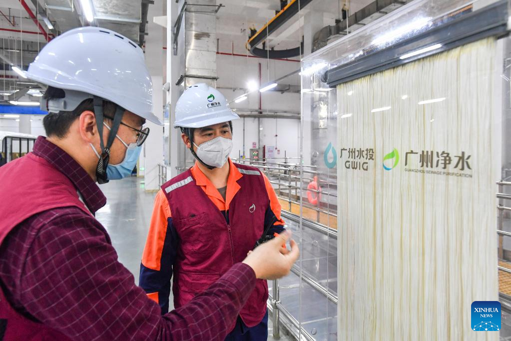 Technicians work at Guangzhou Xilang sewage treatment plant in Guangzhou, south China's Guangdong Province, Dec. 21, 2021. Traditional sewage treatment plants are being transformed into ecological underground sewage treatment plants in Guangzhou, to improve land utilization and tackle problems of secondary pollution.