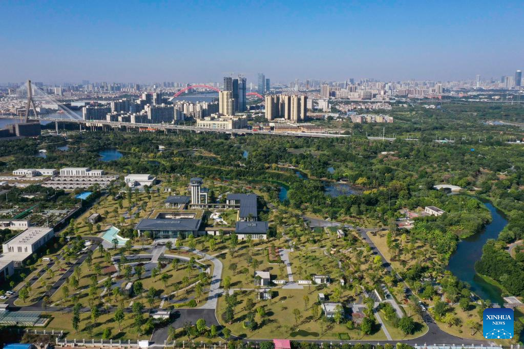 Photo taken on Nov. 24, 2021 shows Guangzhou Lijiao sewage treatment plant and a wetland in Guangzhou, south China's Guangdong Province. Traditional sewage treatment plants are being transformed into ecological underground sewage treatment plants in Guangzhou, to improve land utilization and tackle problems of secondary pollution.