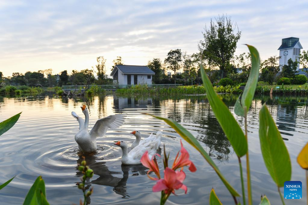 Geese swim in a pond at Guangzhou Shijing sewage treatment plant in Guangzhou, south China's Guangdong Province, Nov. 19, 2021. Traditional sewage treatment plants are being transformed into ecological underground sewage treatment plants in Guangzhou, to improve land utilization and tackle problems of secondary pollution.
