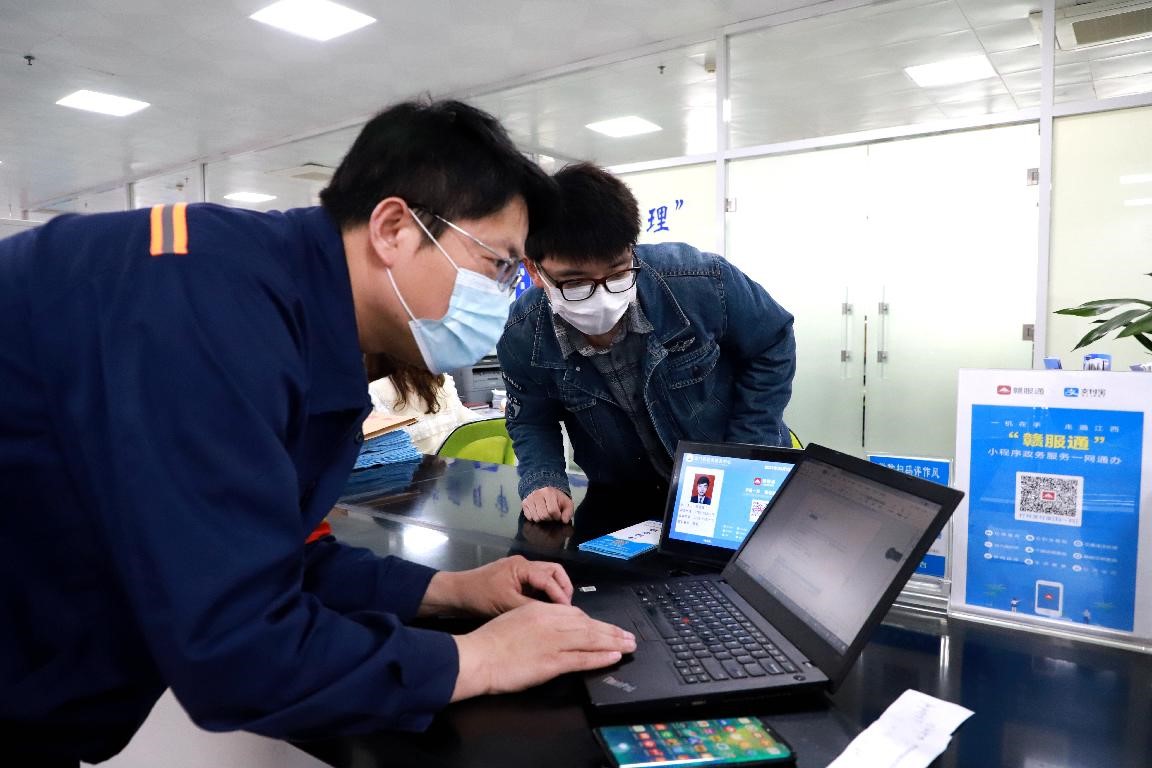 A staff member instructs a man to go through project approval formalities at a government service center in Hukou county, Jiujiang, east China’s Jiangxi province, April 13, 2021. (People’s Daily Online/ Zheng Feihua)