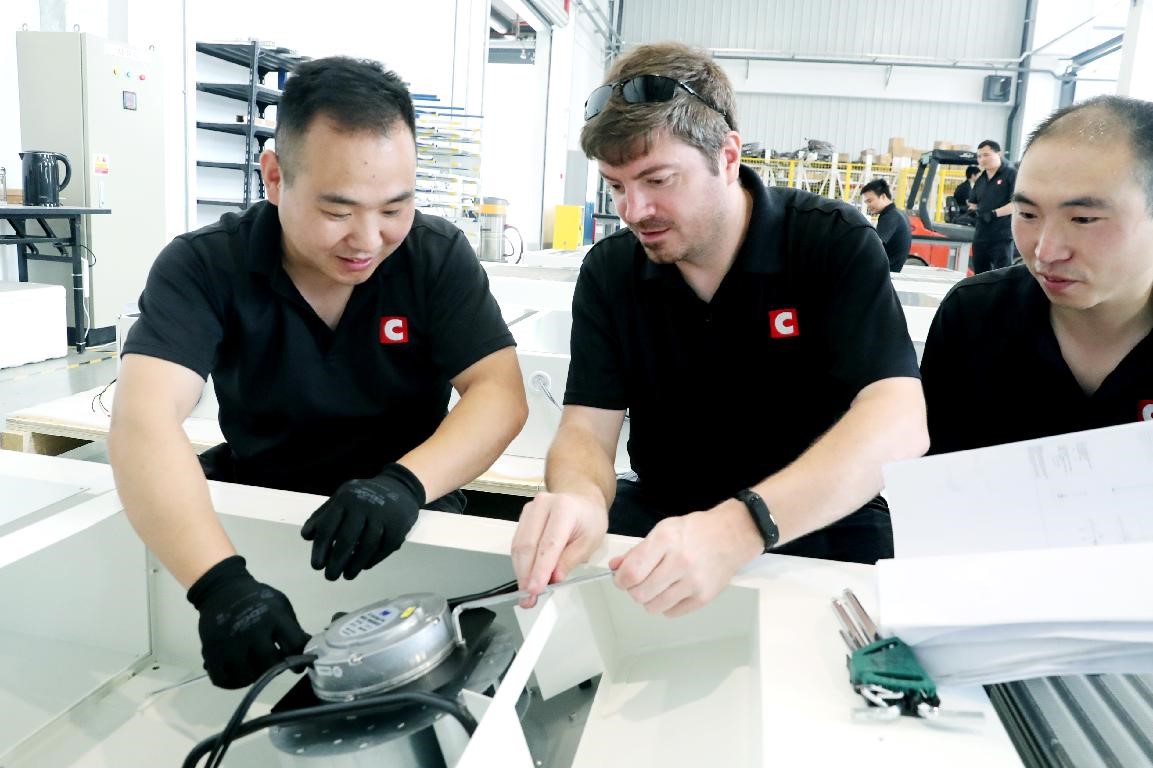 Chinese and German technicians of a German company in Suzhou, east China’s Jiangsu province install a heat sink, May 25, 2021. (People’s Daily/Hua Xuegen)