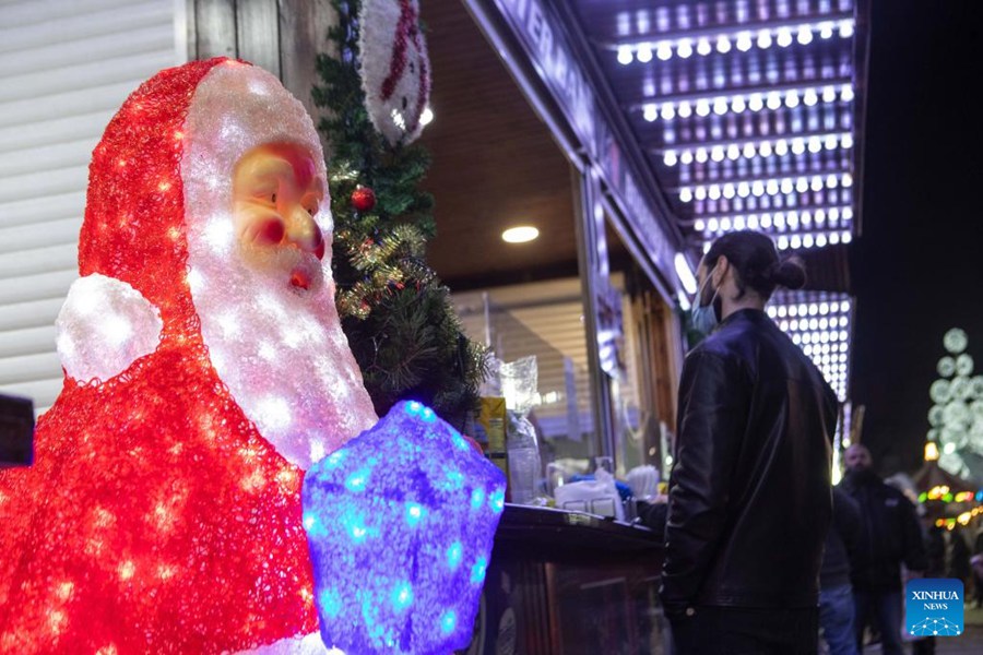 A man with a face mask visits a Christmas fair in the old city of Nicosia, Cyprus, on Dec. 24, 2021. (Photo by George Christophorou/Xinhua)