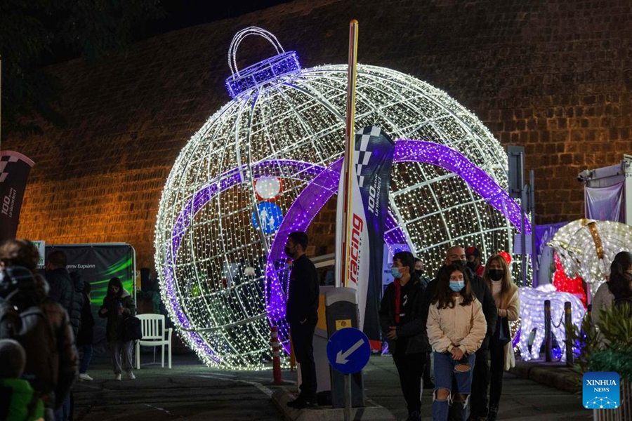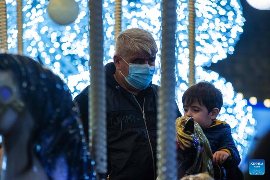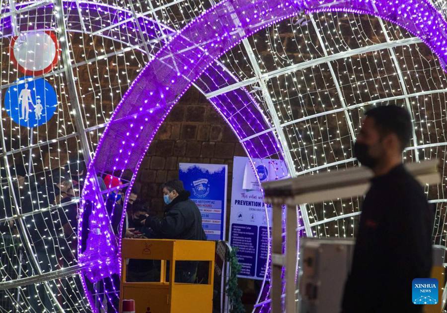 People wearing face masks visit a Christmas fair in the old city of Nicosia, Cyprus, on Dec. 24, 2021. (Photo by George Christophorou/Xinhua)