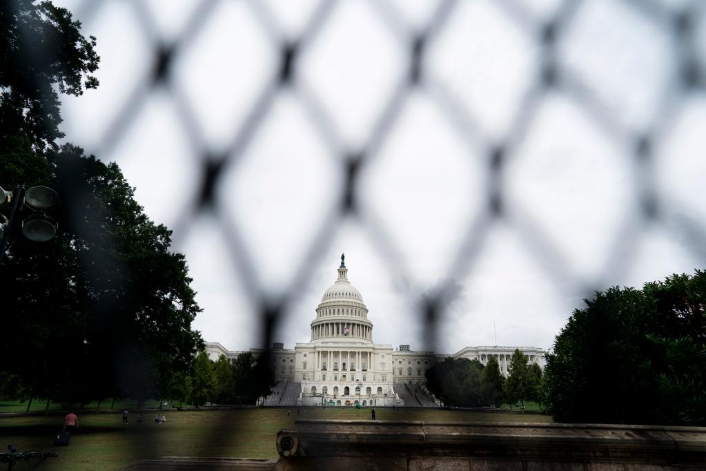 Photo taken on Sept. 17, 2021 shows the U.S. Capitol building, seen through a barrier fence, in Washington, D.C., the United States. (Xinhua/Liu Jie)