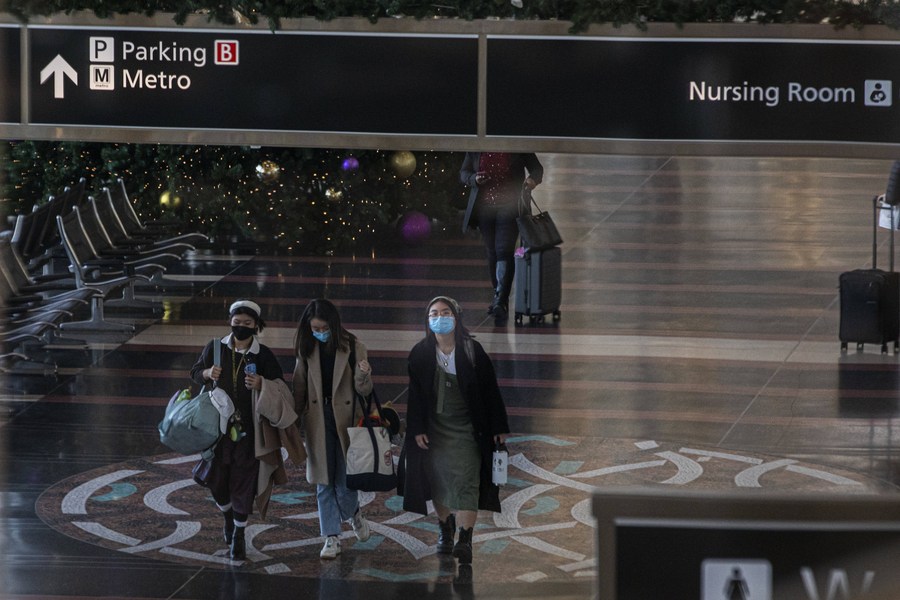 Passengers wearing face masks are seen at Ronald Reagan Washington National Airport in Arlington, Virginia, the United States, Dec. 4, 2021. (Photo by Aaron Schwartz/Xinhua)