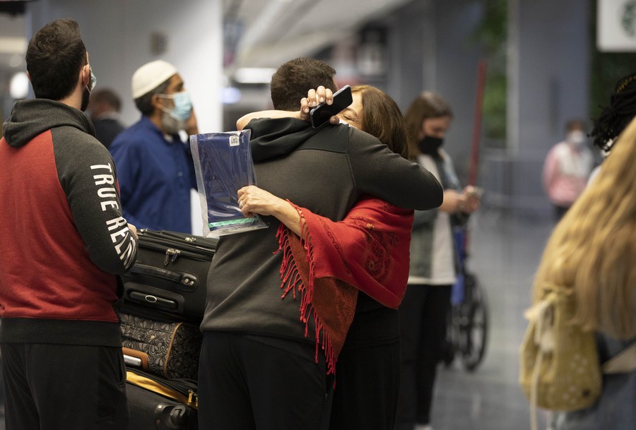 International tourists arrive at San Francisco International Airport, the United States, Nov. 8, 2021. (Photo by Li Jianguo/Xinhua)