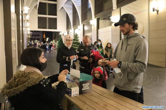 People buy face masks before entering a Christmas market in downtown Beirut, Lebanon, on Dec. 25, 2021. Lebanon's Health Ministry announced on Saturday that the number of cases of COVID-19 Omicron variant stands at 433 so far. (Xinhua/Liu Zongya)