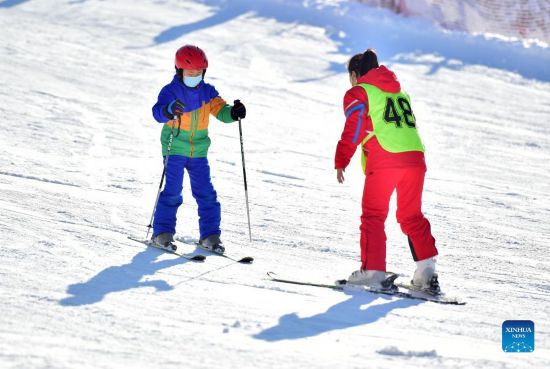 An instructor teaches a kid to ski at a ski resort in Shijiazhuang, north China's Hebei Province, Dec. 25, 2021. (Photo by Zhang Xiaofeng/Xinhua)