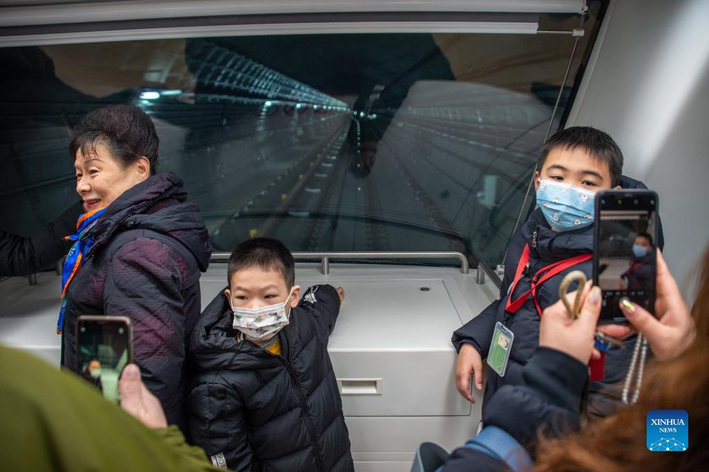Passengers pose for photos on the first carriage of a train of the Metro Line 5 in Wuhan, central China's Hubei Province, Dec. 26, 2021. Three urban rail lines in Wuhan opened to the public on Sunday - Line 5, the second phase of Line 6, and Line 16 (Hannan), boasting a total length of 75.2 km. Line 5 is Wuhan's first fully automated metro line. Line 16 is built along the Yangtze River, with the highest station standing at 30 meters, offering passengers a nice view. The total length of metro rails in operation in Wuhan has reached 435 km. (Photo by Wu Zhizun/Xinhua)