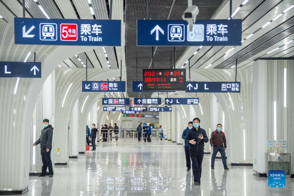 Photo taken on Dec. 26, 2021 shows the Xujiapeng Station of the Metro Line 5 in Wuhan, central China's Hubei Province. Three urban rail lines in Wuhan opened to the public on Sunday - Line 5, the second phase of Line 6, and Line 16 (Hannan), boasting a total length of 75.2 km. Line 5 is Wuhan's first fully automated metro line. Line 16 is built along the Yangtze River, with the highest station standing at 30 meters, offering passengers a nice view. The total length of metro rails in operation in Wuhan has reached 435 km. (Photo by Wu Zhizun/Xinhua)