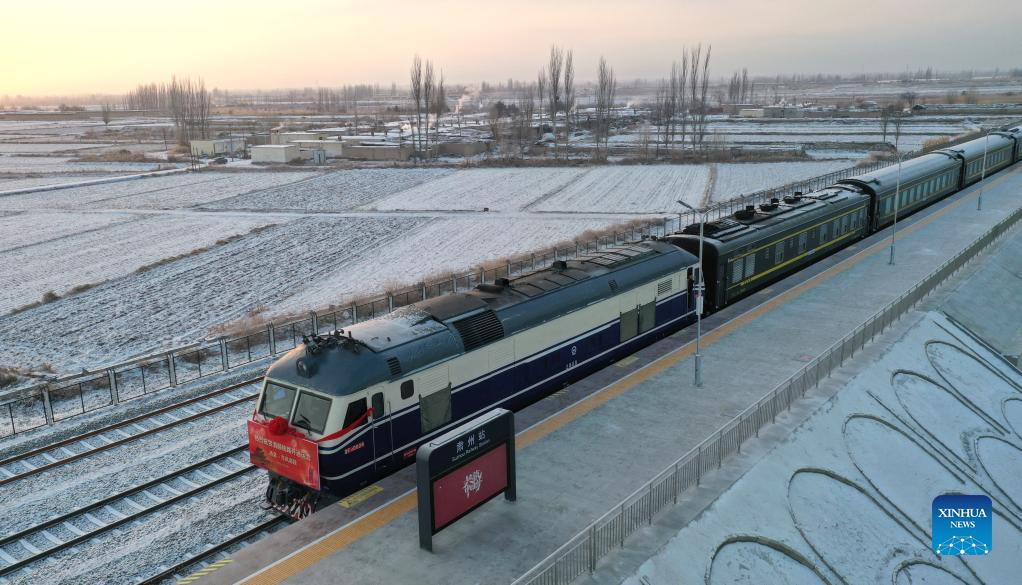 Aerial photo taken on Dec. 26, 2021 shows the first train of the Jiuqian-Dongfeng section of Jiuquan-Ejina railway setting off from Suzhou Railway Station in Jiuquan City, northwest China's Gansu Province. The Jiuqian-Dongfeng section of the railway linking Jiuquan of northwest China's Gansu Province and Ejina Banner of north China's Inner Mongolia Autonomous Region started operation after upgrading on Sunday. The section, with a length of 243.731 km, traverses Badanjilin Desert. (Xinhua/Chen Bin)