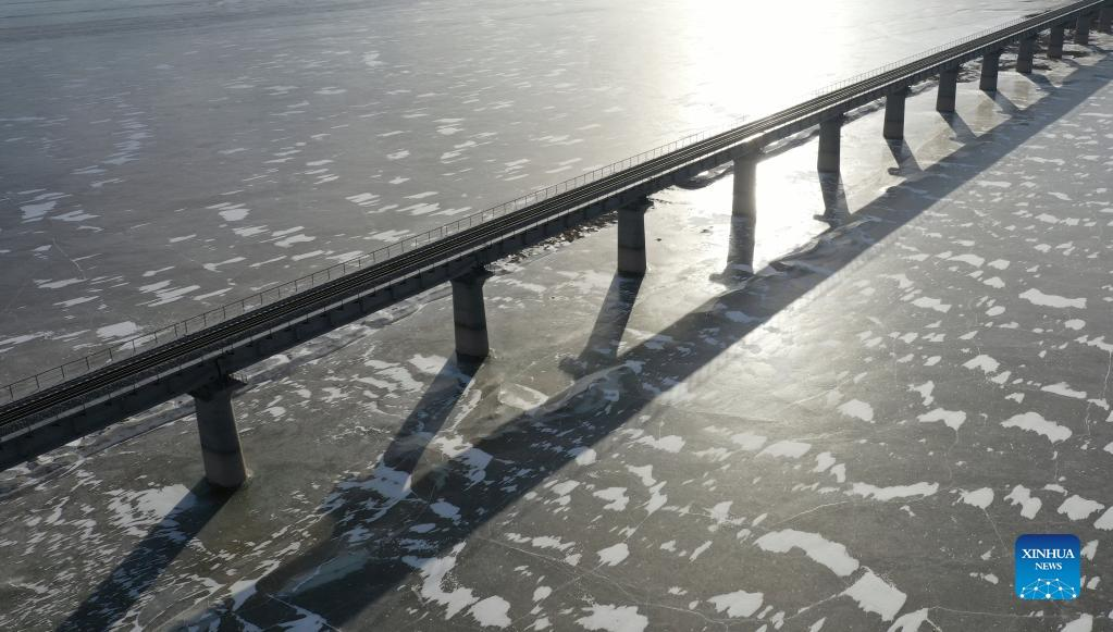 Aerial photo taken on Dec. 25, 2021 shows No.1 Heihe River Bridge of the Jiuquan-Ejina railway. The Jiuqian-Dongfeng section of the railway linking Jiuquan of northwest China's Gansu Province and Ejina Banner of north China's Inner Mongolia Autonomous Region started operation after upgrading on Sunday. The section, with a length of 243.731 km, traverses Badanjilin Desert. (Xinhua/Chen Bin)