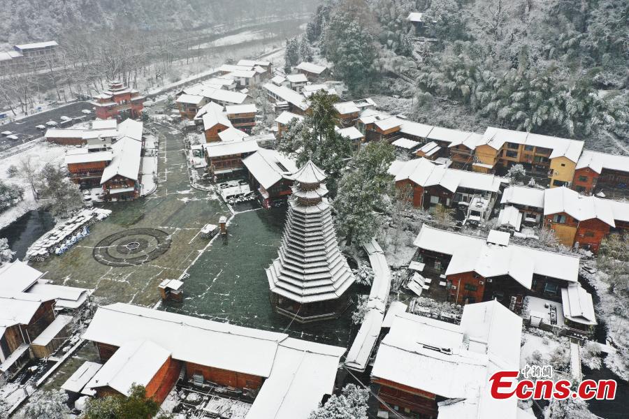 Snow-capped Shadong village looks picturesque at the foot of Fanjing Mountain in the southwest China’s Guizhou Province, Dec. 26, 2021. (China News Service/Li he)