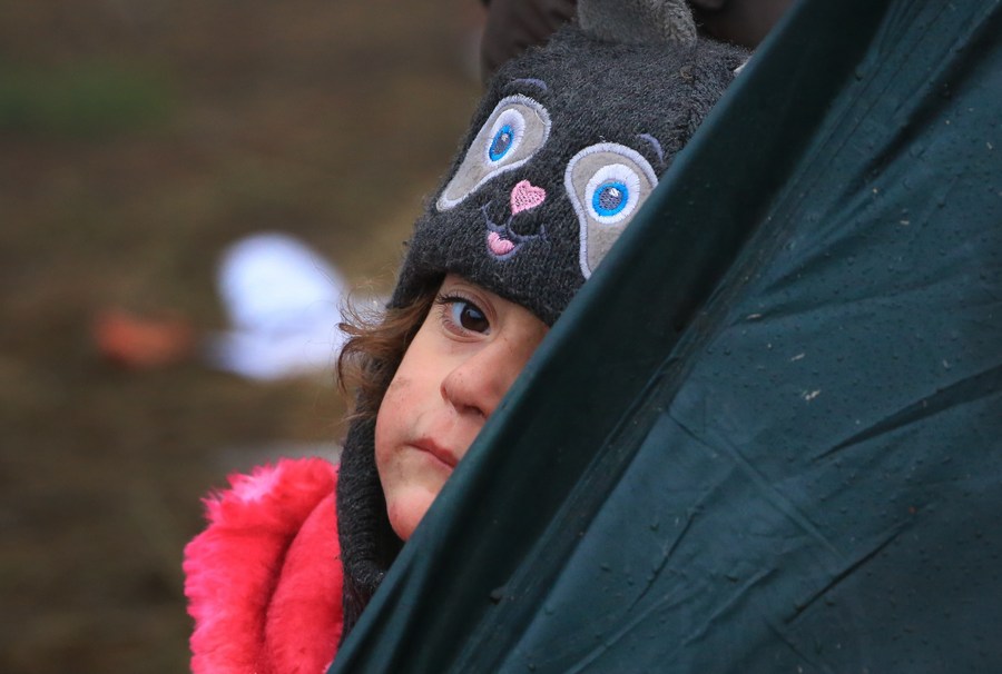 A child is seen at a refugee camp near the Belarusian-Polish border in Belarus, Nov. 14, 2021. (Photo by Henadz Zhinkov/Xinhua)