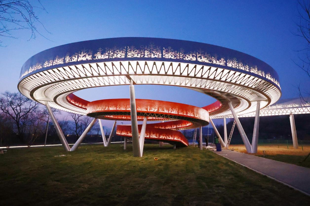 A landmark installation called “Ring of Winter Olympics” is being tested in the Beijing Olympic Winter Park, Dec. 22, 2021. (People’s Daily Online/Chen Xiaogen)