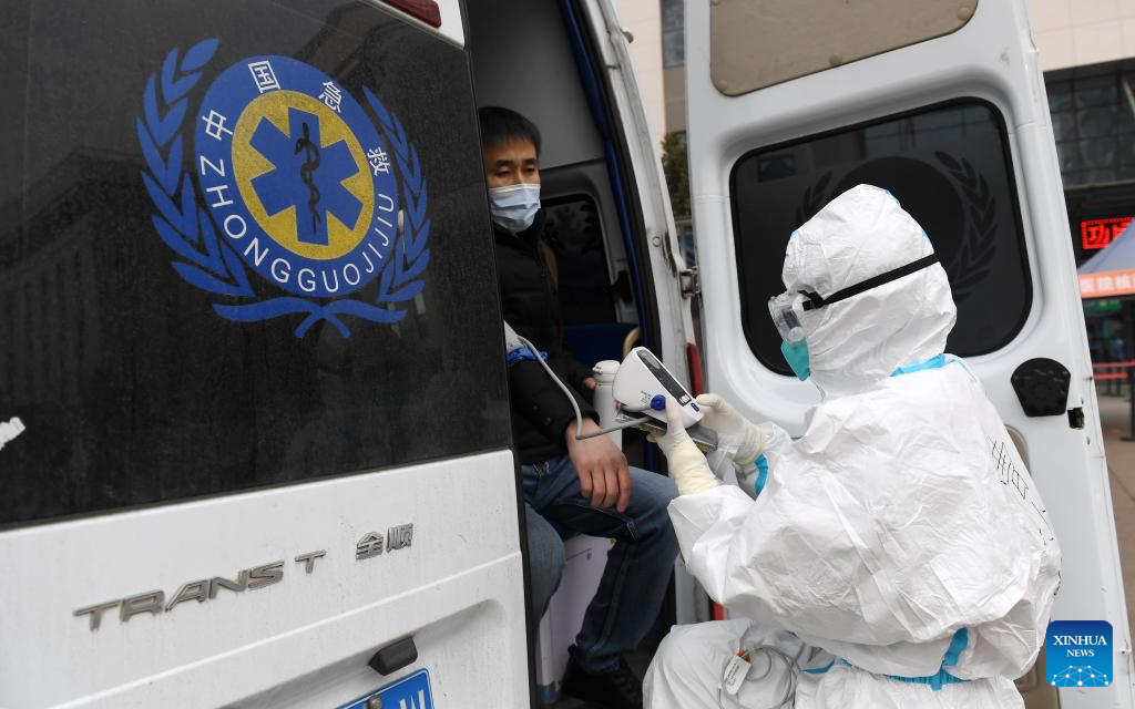 A medical worker checks on a patient transported by an ambulance at the 1st Affiliated Hospital of Xi'an Jiaotong University in Xi'an, northwest China's Shaanxi Province, Dec. 27, 2021. Two hospitals affiliated to Xi'an Jiaotong University have resumed outpatient and emergency services with strict epidemic prevention and control measures, as the city is coping with a recent resurgence of COVID-19. (Xinhua/Li Yibo)