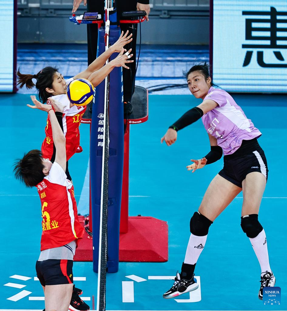 Chen Peiyan (R) of Guangdong spikes during the Group E match between Liaoning and Guangdong at the second stage of the 2021-2022 season Chinese Women's Volleyball Super League in Jiangmen, south China's Guangdong Province, Dec. 27, 2021. (Xinhua/Yang Zhisen)
