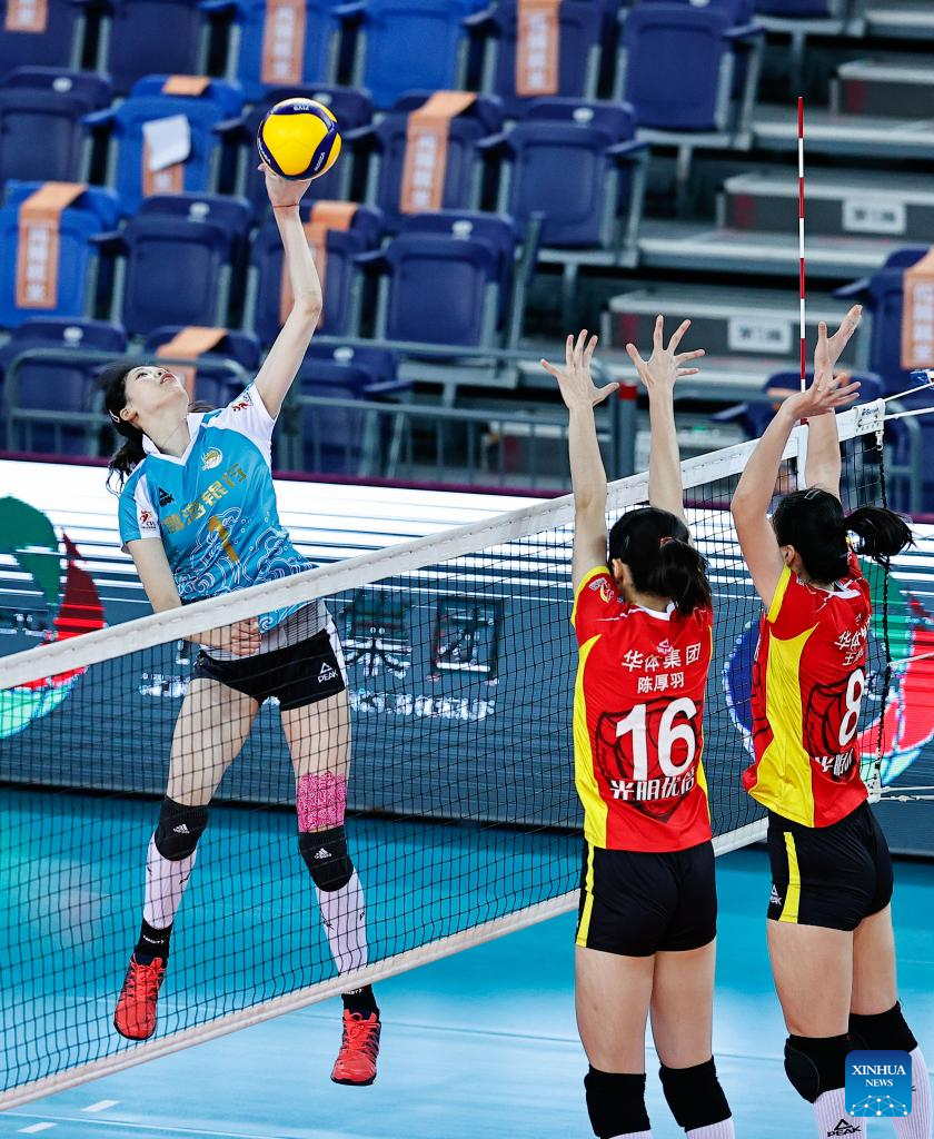 Li Yingying (L) of Tianjin spikes the ball during the Group E match between Tianjin and Shanghai at the second stage of the 2021-2022 season Chinese Women's Volleyball Super League in Jiangmen, south China's Guangdong Province, Dec. 27, 2021. (Xinhua/Yang Zhisen)