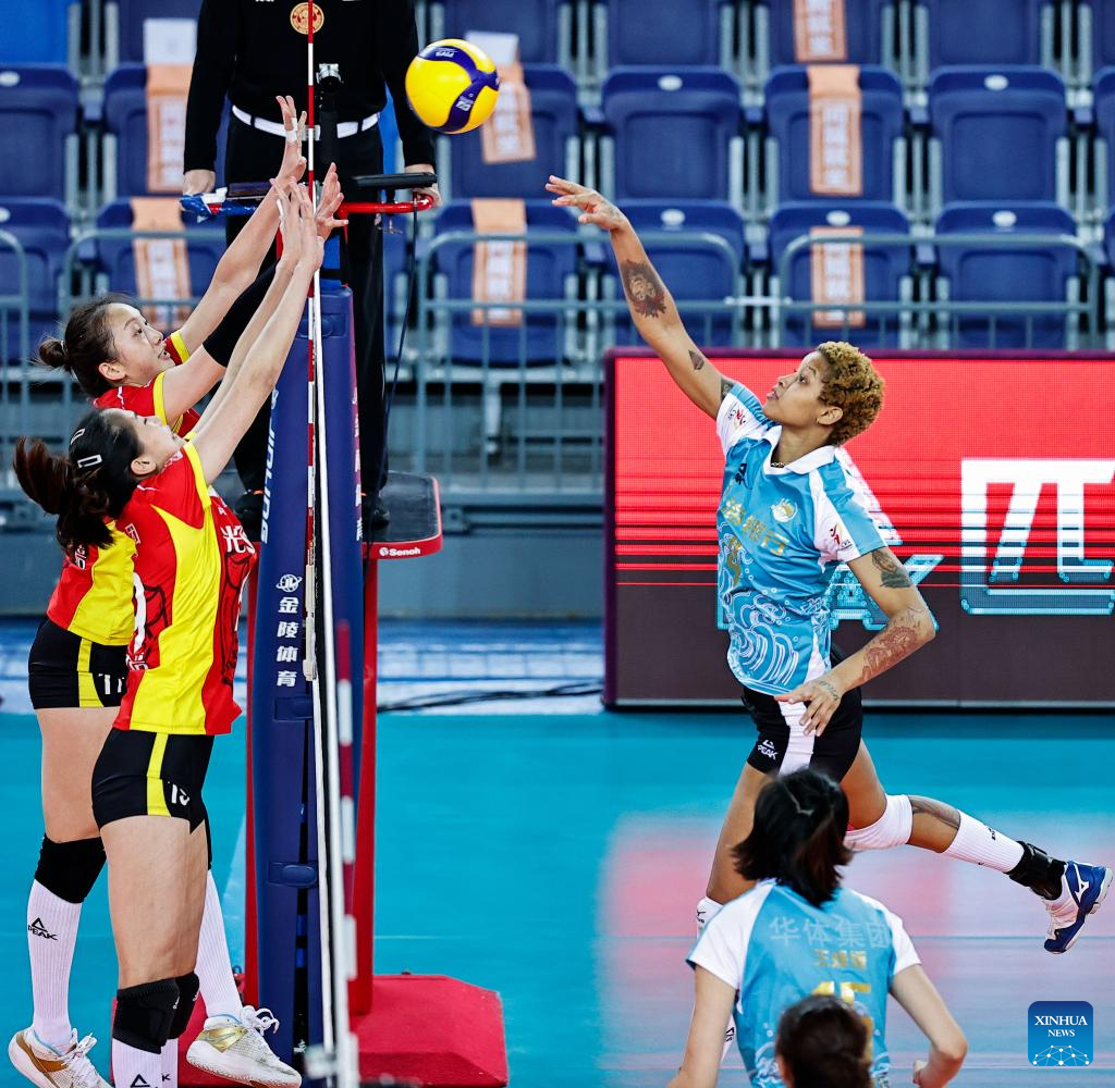 Vargas Melissa (top R) of Tianjin competes during the Group E match between Tianjin and Shanghai at the second stage of the 2021-2022 season Chinese Women's Volleyball Super League in Jiangmen, south China's Guangdong Province, Dec. 27, 2021. (Xinhua/Yang Zhisen)