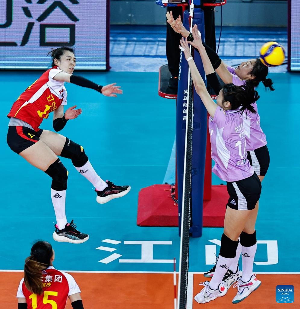 Duan Fang (L) of Liaoning spikes during the Group E match between Liaoning and Guangdong at the second stage of the 2021-2022 season Chinese Women's Volleyball Super League in Jiangmen, south China's Guangdong Province, Dec. 27, 2021. (Xinhua/Yang Zhisen)
