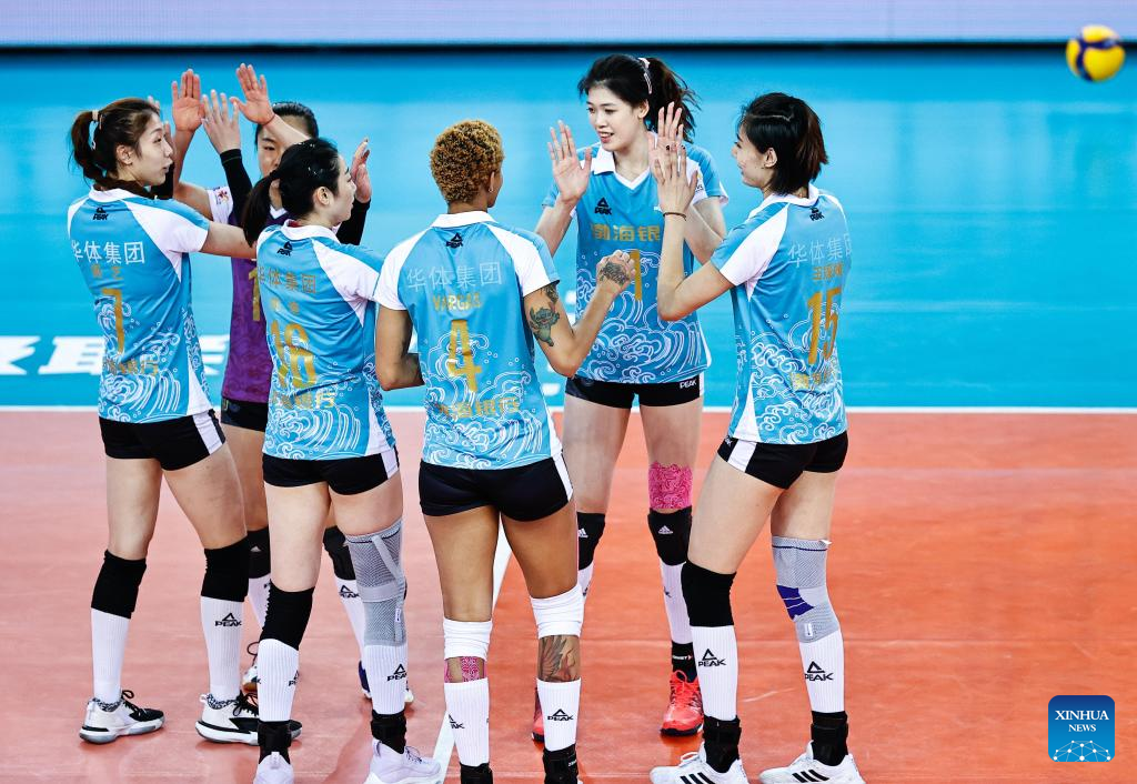 Players of Tianjin celebrate a goal during the Group E match between Tianjin and Shanghai at the second stage of the 2021-2022 season Chinese Women's Volleyball Super League in Jiangmen, south China's Guangdong Province, Dec. 27, 2021. (Xinhua/Yang Zhisen)