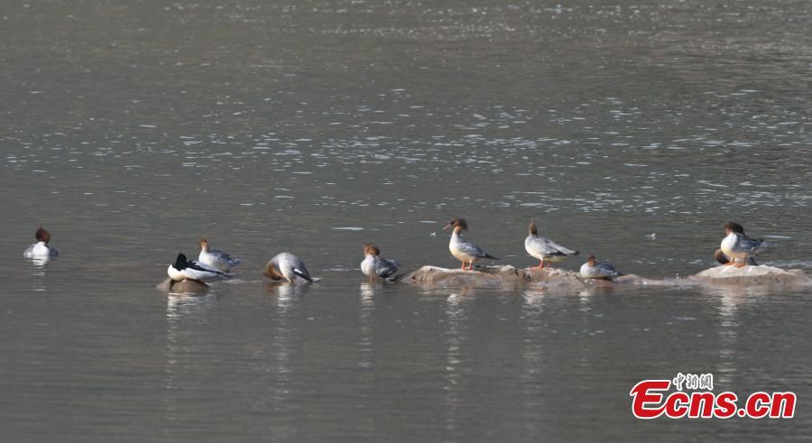 Chinese Mergansers, an endangered bird species, winter at a river in Jian'ou City in Nanping, southeast China's Fujian Province, December 2021. (China News Service/Chen Wenxin)