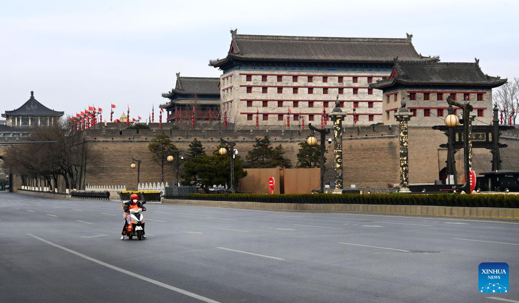 A deliveryman is seen on an empty street near Yongning Gate in Xi'an, northwest China's Shaanxi Province, Dec. 28, 2021. Authorities in Xi'an have upgraded epidemic control and prevention measures starting Monday, ordering all residents to stay indoors and keep away from gatherings except when taking nucleic acid tests. (Xinhua/Tao Ming)