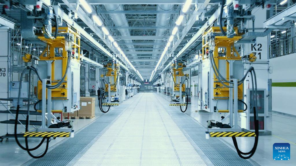 Photo taken on Dec. 21, 2021 shows the inside of the new Tiexi Plant of BMW Brilliance Automotive (BBA) in Shenyang, northeast China's Liaoning Province. German luxury carmaker BMW on Dec. 16 announced its upgraded strategy in the Chinese market, with three new or upgraded plants that are in Shenyang and Zhangjiagang to open in 2022. (Xinhua)