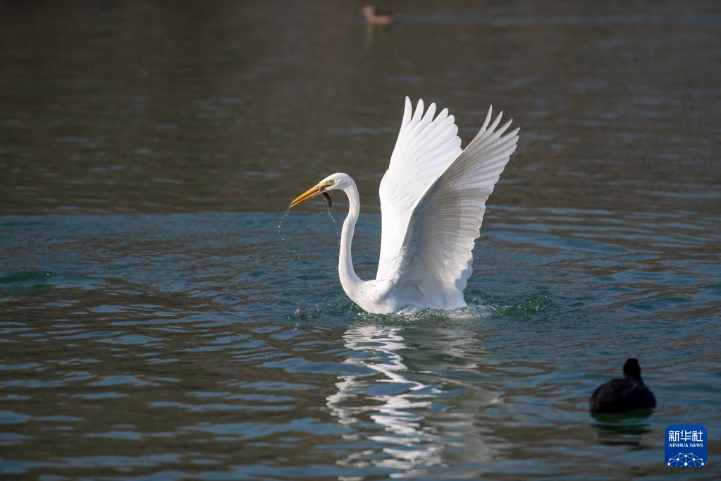 An egret forages at Fenhe river wetland park in Taiyuan, north China's Shanxi Province, Dec. 28, 2021. (Xinhua/Yang Chenguang)