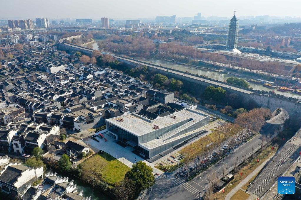 Aerial photo taken on Dec. 28, 2021 shows the city wall museum of Nanjing and its surrounding landscape in Nanjing, capital of east China's Jiangsu Province. The Nanjing city wall museum opened for trial service here Tuesday. It will showcase the historic and cultural value of the Nanjing city wall from various aspects. (Xinhua/Ji Chunpeng)