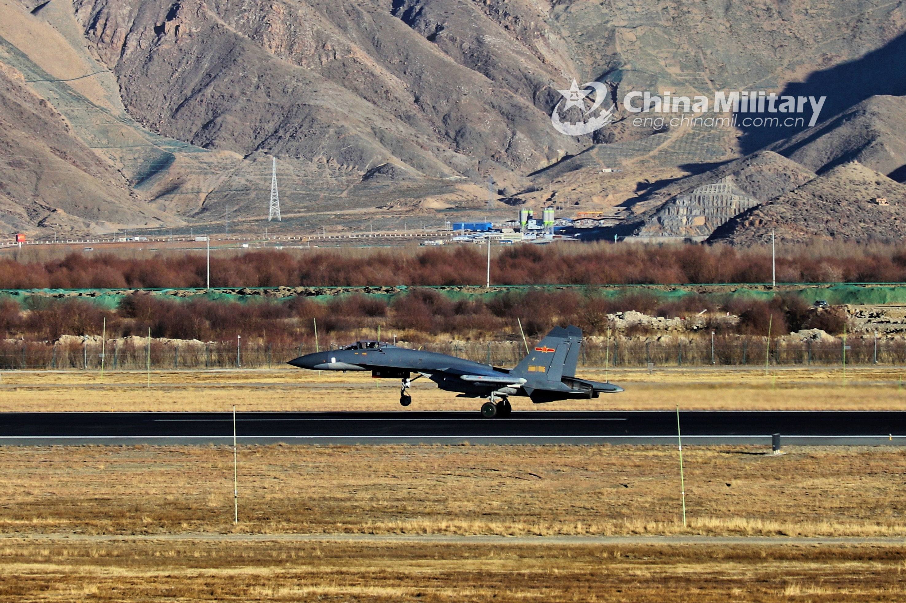 A fighter jet attached to an aviation brigade of the air force under the PLA Western Theater Command takes off for a flight training mission from December 21 to 22, 2021. (eng.chinamil.com.cn/Photo by Wen Rui)