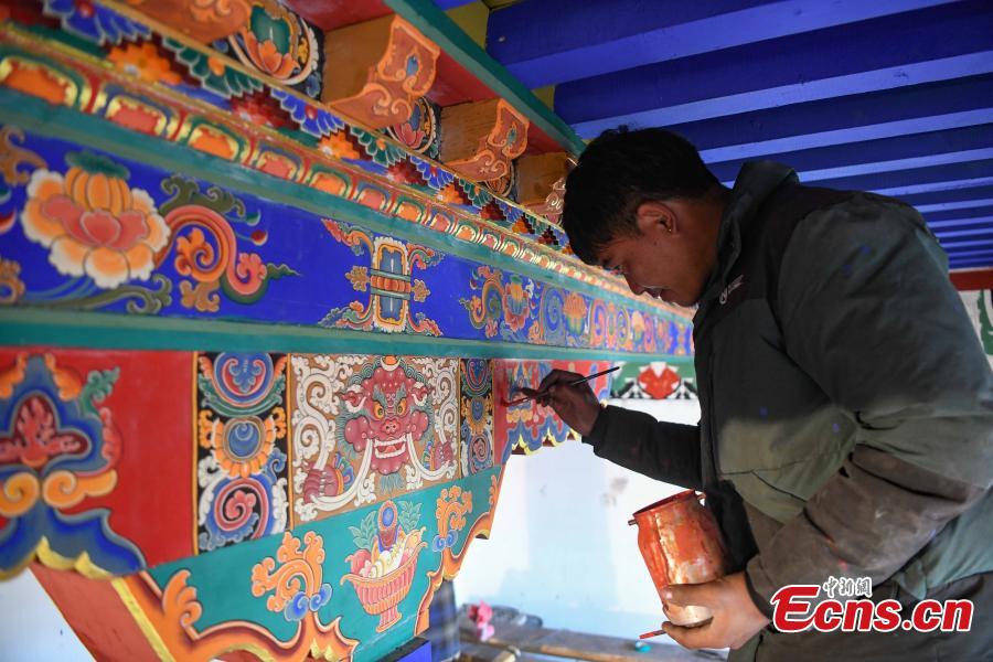 A craftsperson from a handcraft cooperative decorates a house in traditional Tibetan style in Lhasa, southwest China's Tibet Autonomous Region, Dec. 28, 2021. (Photo/China News Service)