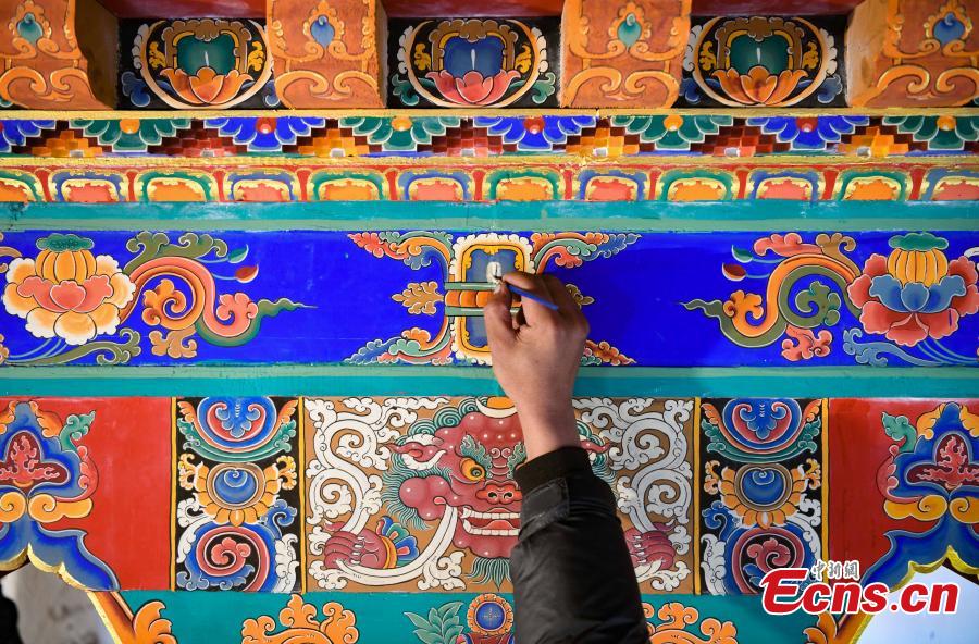 A craftsperson from a handcraft cooperative decorates a house in traditional Tibetan style in Lhasa, southwest China's Tibet Autonomous Region, Dec. 28, 2021. (Photo/China News Service)