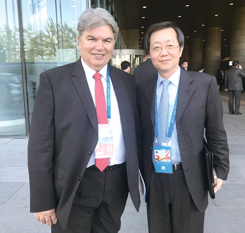 Photo shows Tassos Vamvakidis posing for a picture with Xu Lirong, chairman of China COSCO Shipping. (Photo/Global People)