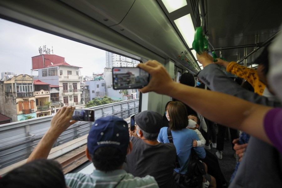 Passengers take photos on a train on Cat Linh-Ha Dong metro line in Hanoi, Vietnam, Nov. 6, 2021. (VNA via Xinhua)