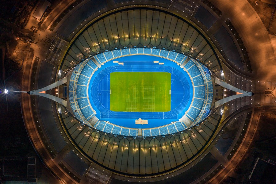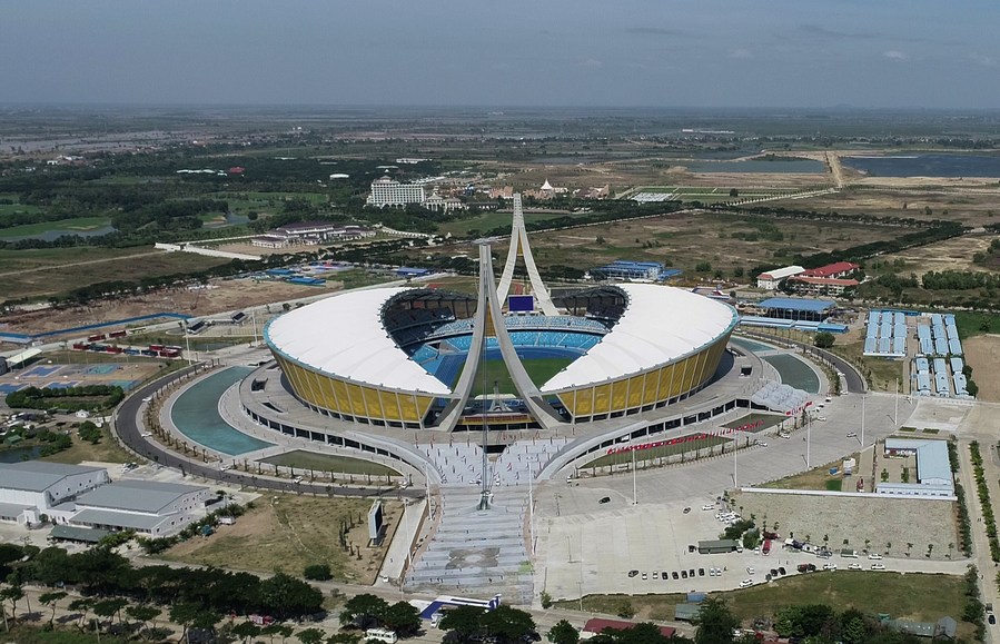 Aerial photo taken on Dec. 17, 2021 shows the China-funded Morodok Techo National Stadium in Phnom Penh, Cambodia. (Photo by Sovannara/Xinhua)