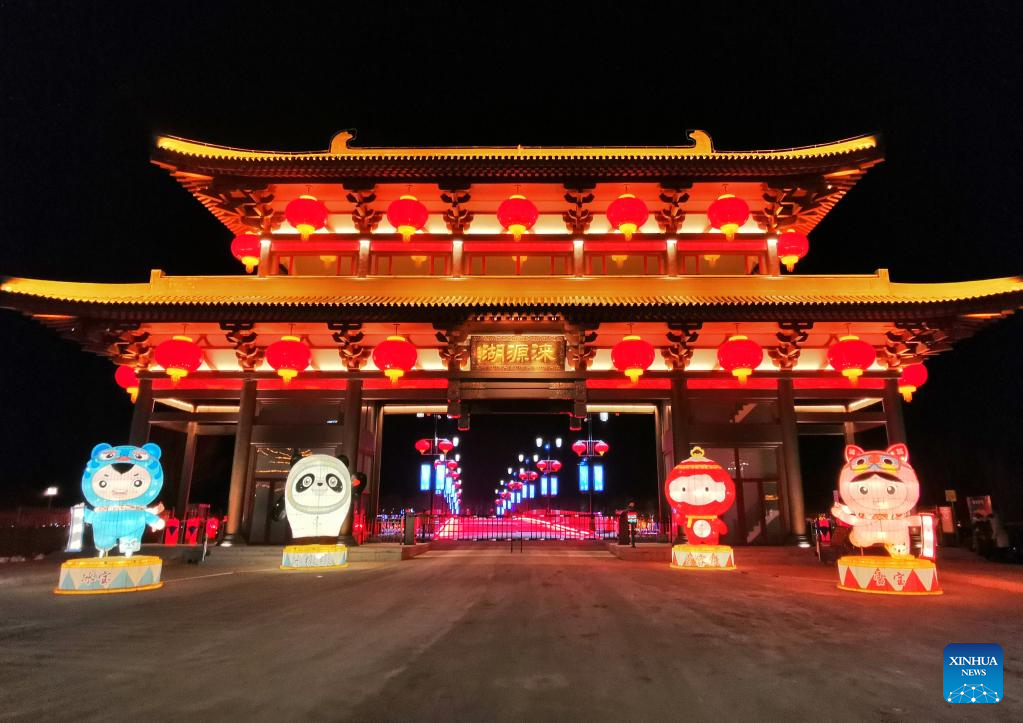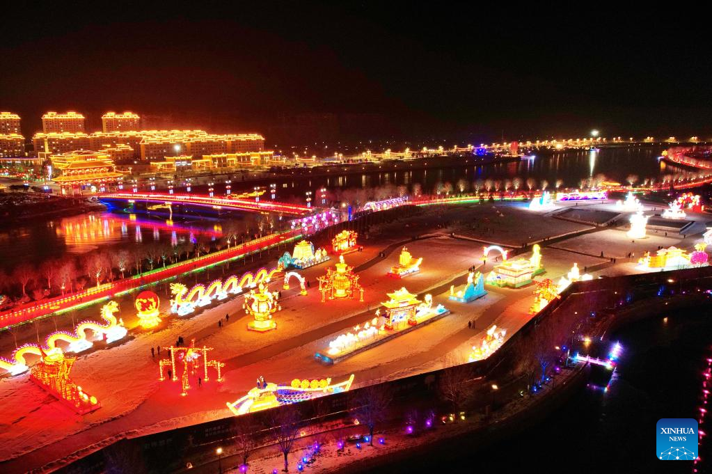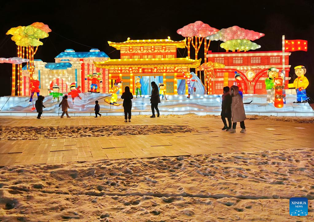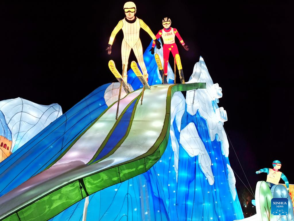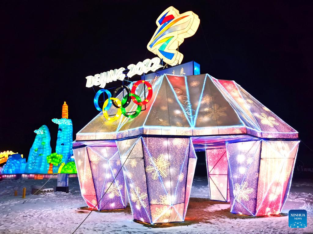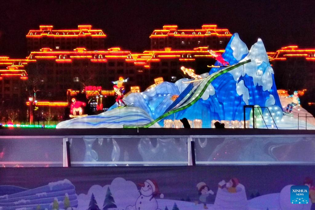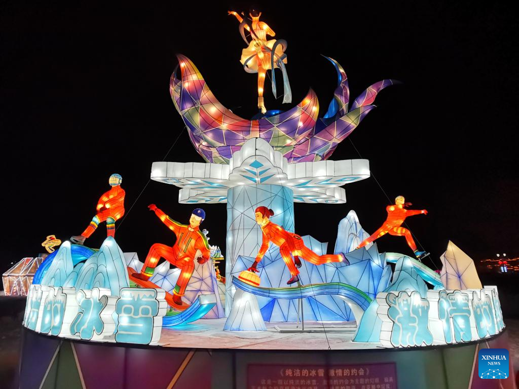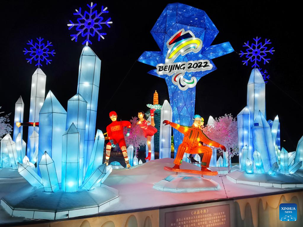 Colorful lanterns themed on winter sports are displayed at Binhu Park in Laiyuan County, north China's Hebei Province, Dec. 27, 2021. (Photo by Li Hui/Xinhua)