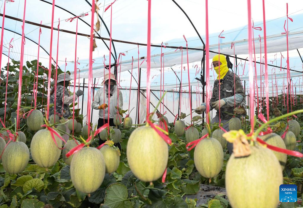 Farmers pick Hami melons in Foluo Town of Ledong County, south China's Hainan Province, Dec. 28, 2021. Over 48,000 mu (about 3,200 hectares) of Hami melons have entered harvest season in Ledong County. With the yearly output of more than 200,000 tonnes, Hami melon planting business has become an important industry in increasing the incomes of local villagers. (Xinhua/Yang Guanyu)