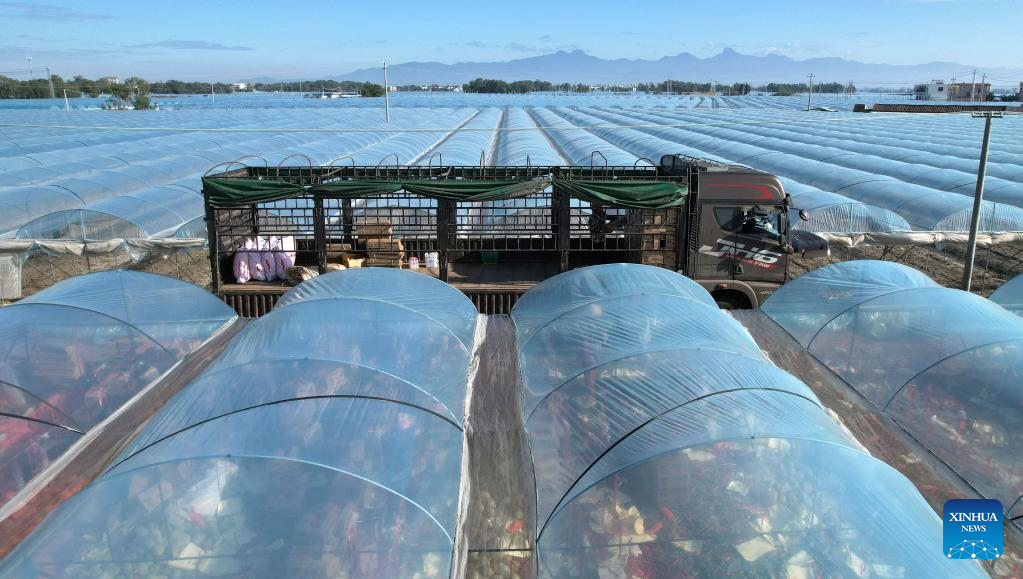 A staff member of a fruit company loads Hami melons onto a truck in Foluo Town of Ledong County, south China's Hainan Province, Dec. 29, 2021. Over 48,000 mu (about 3,200 hectares) of Hami melons have entered harvest season in Ledong County. With the yearly output of more than 200,000 tonnes, Hami melon planting business has become an important industry in increasing the incomes of local villagers. (Xinhua/Yang Guanyu)