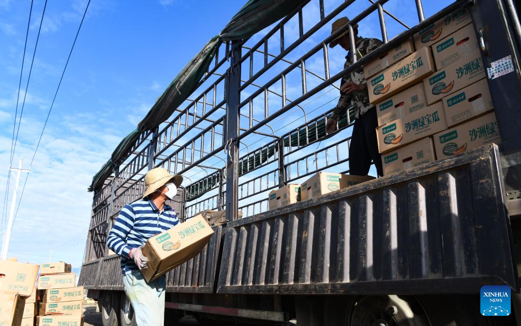 Staff members of a fruit company load Hami melons onto a truck in Foluo Town of Ledong County, south China's Hainan Province, Dec. 29, 2021. Over 48,000 mu (about 3,200 hectares) of Hami melons have entered harvest season in Ledong County. With the yearly output of more than 200,000 tonnes, Hami melon planting business has become an important industry in increasing the incomes of local villagers. (Xinhua/Yang Guanyu)