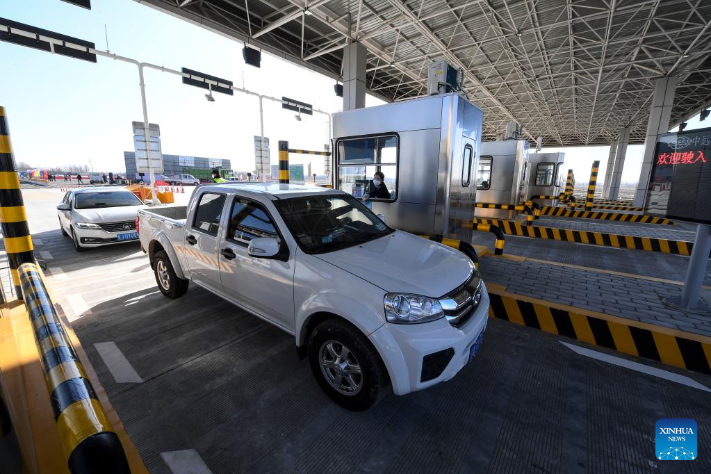 Cars pass through a toll station at the Qingtongxia-Zhongwei section of the Wuhai-Maqin expressway in northwest China's Ningxia Hui Autonomous Region, on Dec. 29, 2021.