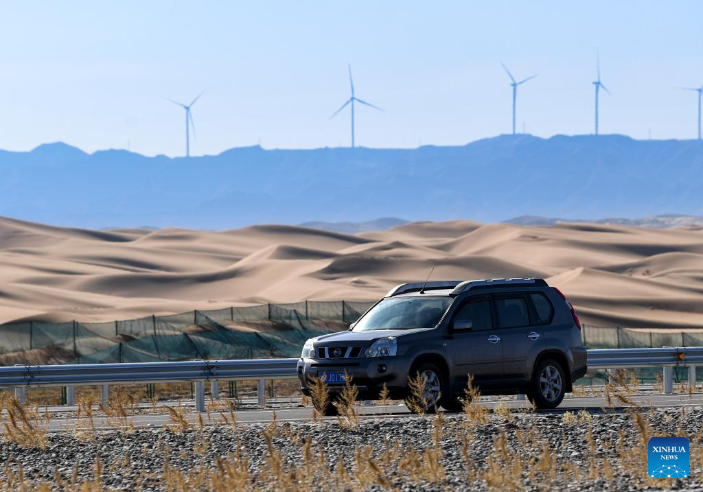 The Qingtongxia-Zhongwei section in Ningxia of the Wuhai-Maqin expressway, linking Wuhai in Inner Mongolia Autonomous Region and Maqin County in Qinghai Province, fully opened to traffic Wednesday. The 122.99-kilometer-long section, of which an 18 kilometers section goes through the hinterland of Tengger Desert, is the first desert expressway built in Ningxia. (Xinhua/Feng Kaihua)