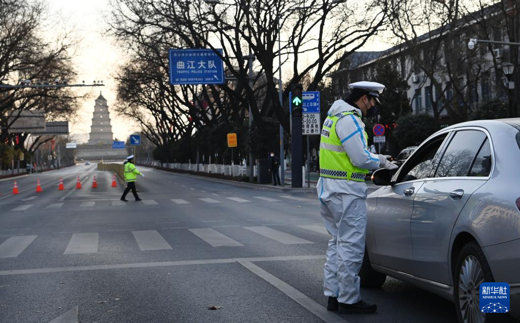 Policemen work on a street in Xi'an, capital of northwest China's Shaanxi Province, Dec. 29, 2021.