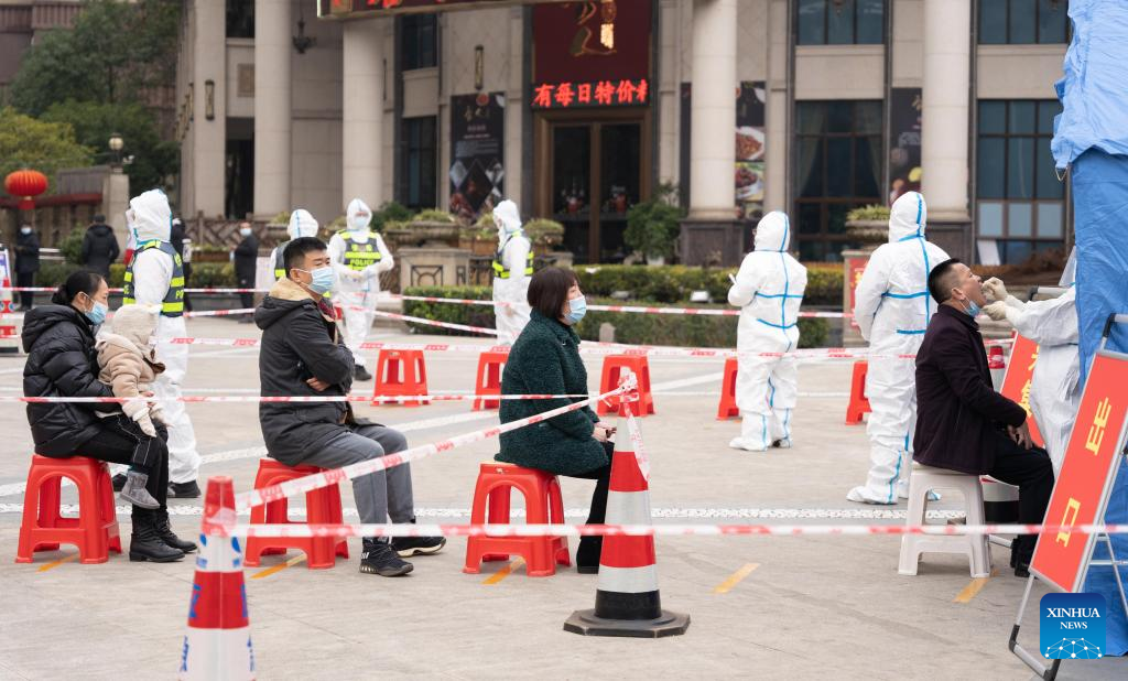 People line up for COVID-19 tests at a COVID-19 testing site in Tongren City, southwest China's Guizhou Province, Dec. 29, 2021. (Photo by Peng Jun/Xinhua)