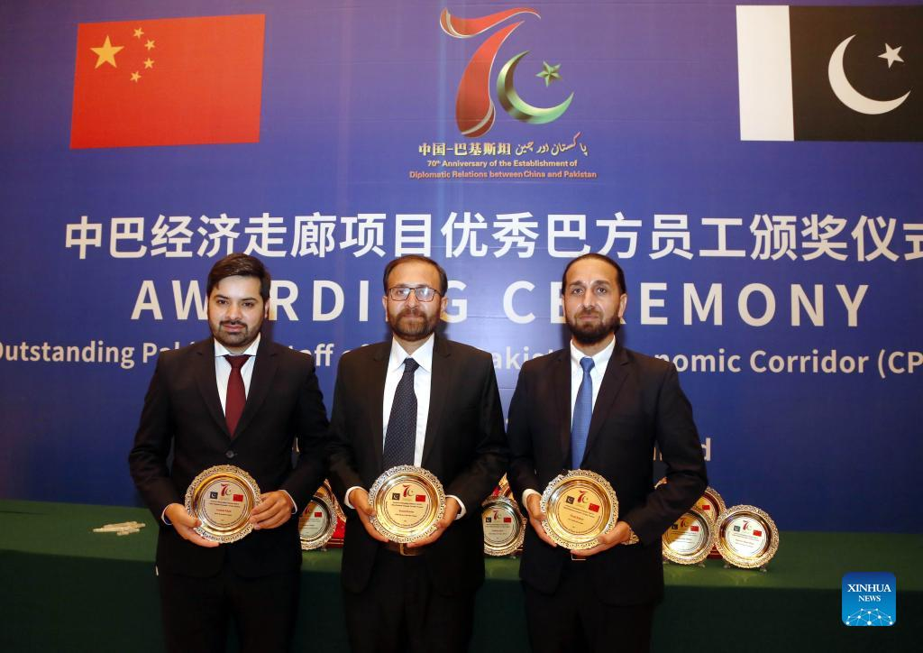 Representatives of awarded Pakistani staff of the China-Pakistan Economic Corridor (CPEC) projects pose for a photo during an award ceremony for outstanding Pakistani staff of CPEC projects in Islamabad, Pakistan, on Dec. 29, 2021. Pakistan's Minister for Planning, Development and Special Initiatives Asad Umar said on Wednesday that the China-Pakistan Economic Corridor (CPEC) continues to be a flagship project of the overall development strategy of Pakistan. Speaking at an award ceremony for outstanding Pakistani staff of CPEC projects, Umar said that apart from being a vital element for his country's economic development, CPEC is also proving as a cornerstone of the economic relationship between China and Pakistan. (Xinhua/Ahmad Kamal)