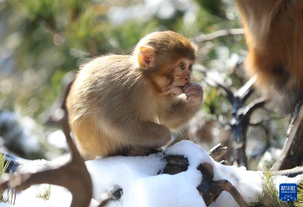 A macaque is seen at Huangshizhai Village of Wulingyuan scenic spot in Zhangjiajie, central China's Hunan Province, Dec. 29, 2021. (Photo by Wu Yongbing/Xinhua)