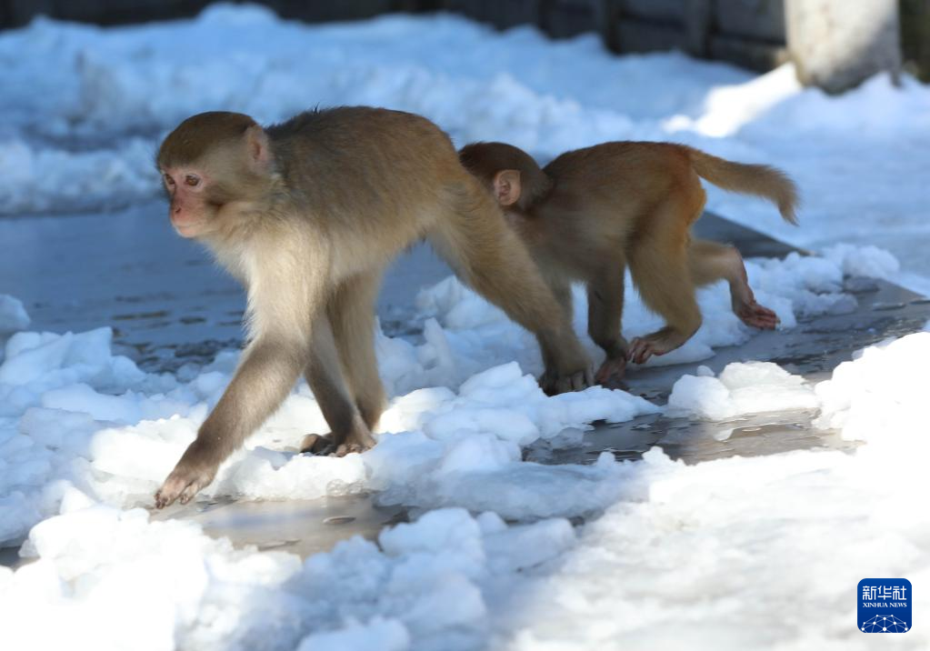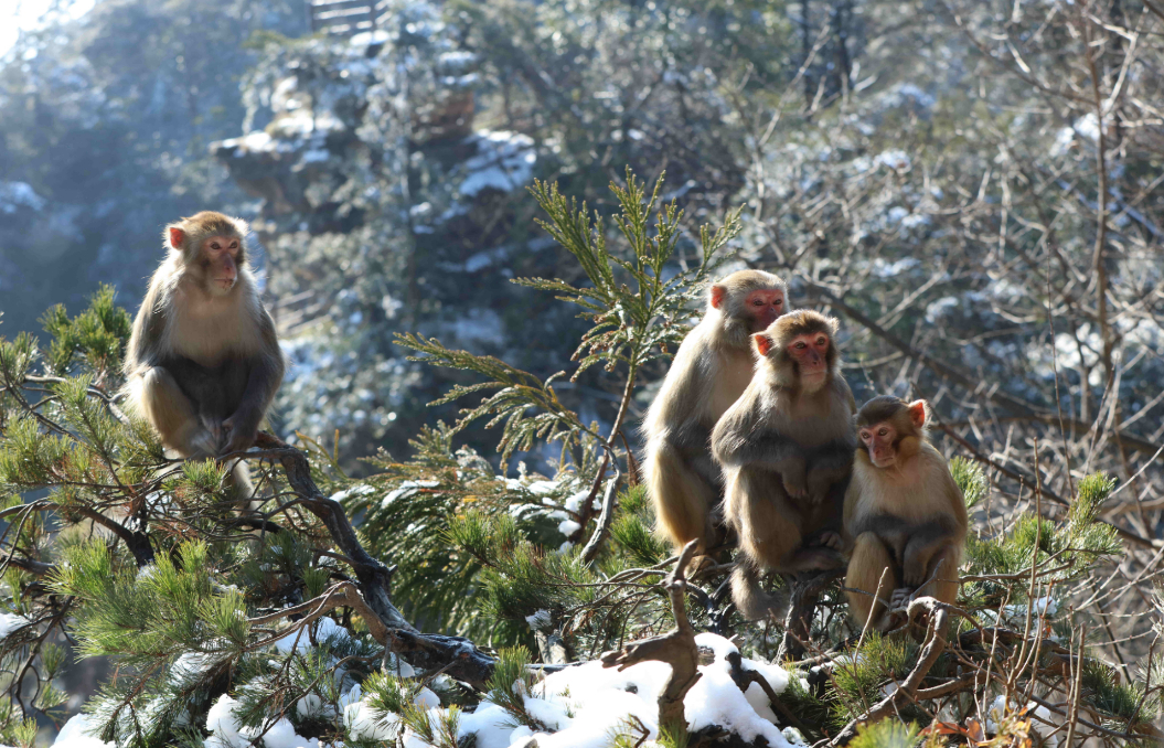 Macaques are seen at Huangshizhai Village of Wulingyuan scenic spot in Zhangjiajie, central China's Hunan Province, Dec. 29, 2021. (Photo by Wu Yongbing/Xinhua)
