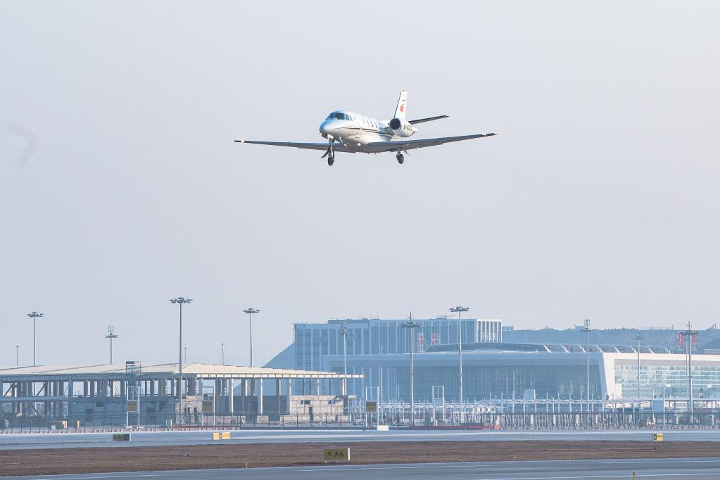 A Cessna 560 airplane lands at the Ezhou Huahu Airport in Ezhou, central China's Hubei Province, Dec. 29, 2021. A Cessna 560 carried out flight verification of the Ezhou Huahu Airport on Wednesday, marking the completion of the cargo-oriented airport. The airport is the country's first cargo airport, with the functional orientation of the air cargo hub and feeder airport for passenger transport. It is also China's first airport project that introduces social capital and enterprises. (Xinhua/Xiao Yijiu)