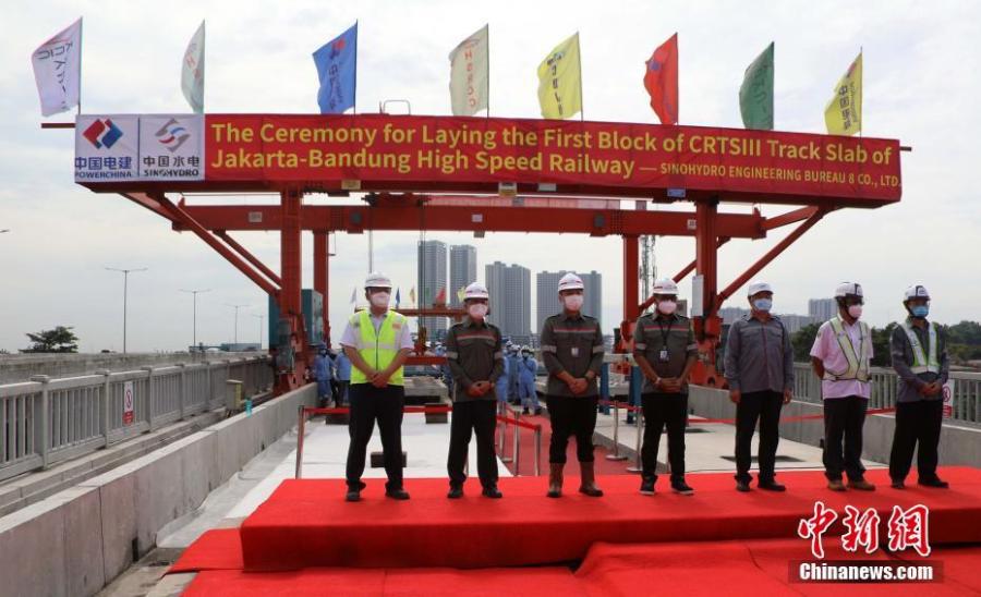 Photo taken on Dec 29, 2021 shows the ceremony of laying Chinese-developed CRTS III ballastless track slabs on the Jakarta-Bandung high-speed railway (HSR) in Indonesia. (China News Service/Tao Yuanyu)