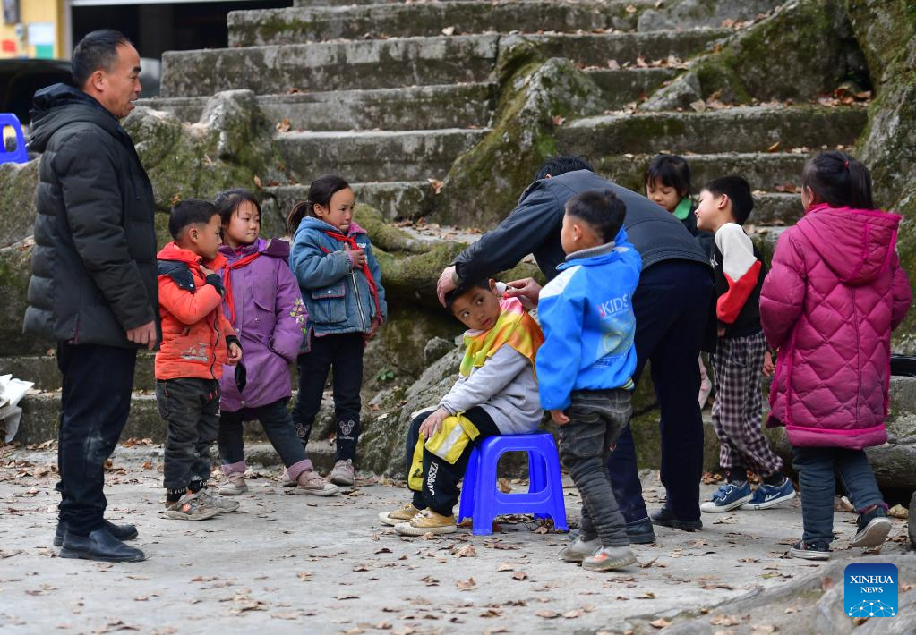 A teacher cuts hair for a student at a teaching point in Wuying Village on the border between south China's Guangxi Zhuang Autonomous Region and southwest China's Guizhou Province, on Dec. 8, 2021.